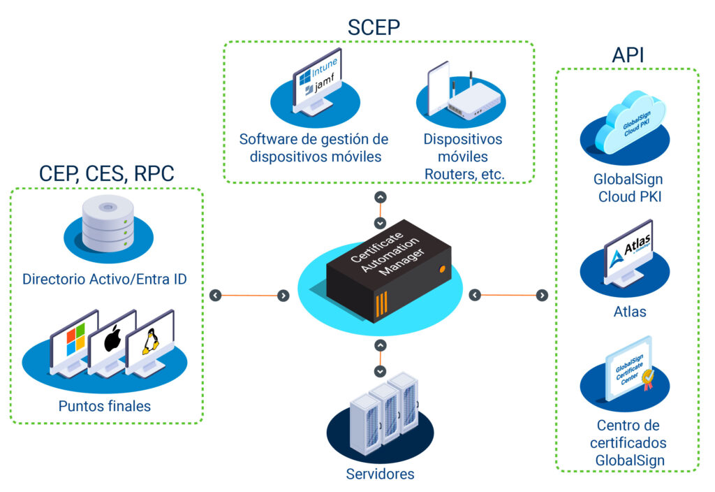 El Certificate Automation Manager (Administrador de Automatización de Certificados) de GlobalSign es una solución de software automatizada, flexible y personalizable que actúa como proxy entre la Plataforma de Identidad Digital Atlas de GlobalSign y tu Microsoft Active Directory o Microsoft Entra ID, permitiendo un aprovisionamiento de certificados sin fricciones basado en tus políticas de grupo.