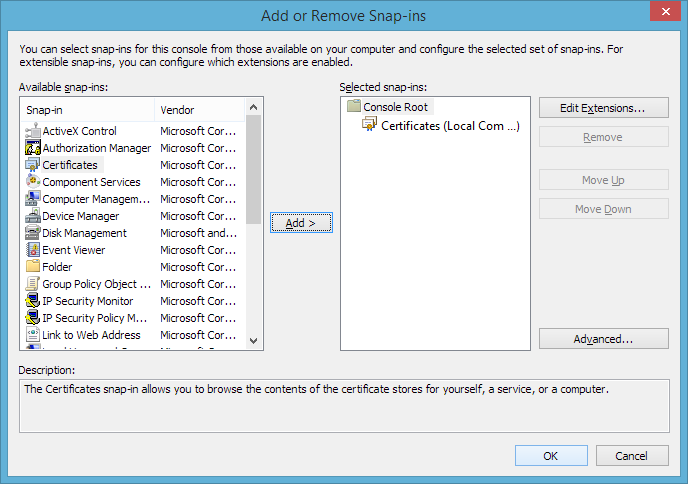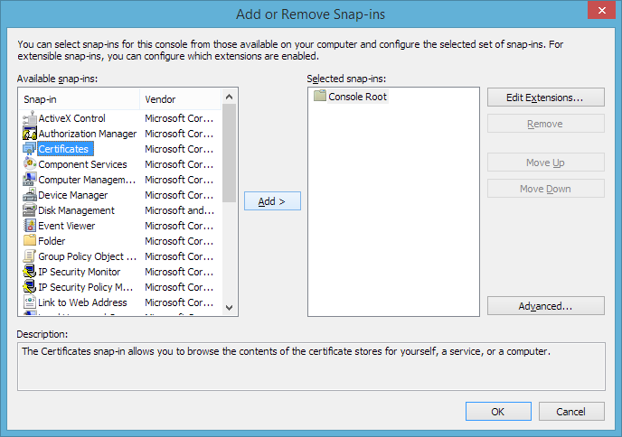 3. Elija los Certificados complemento. Haga clic en Agregar.