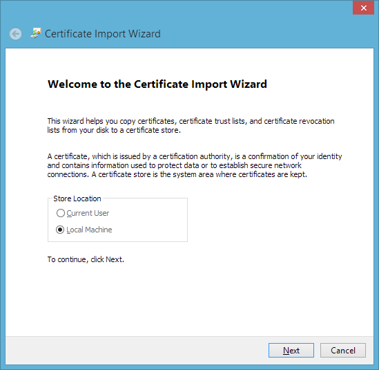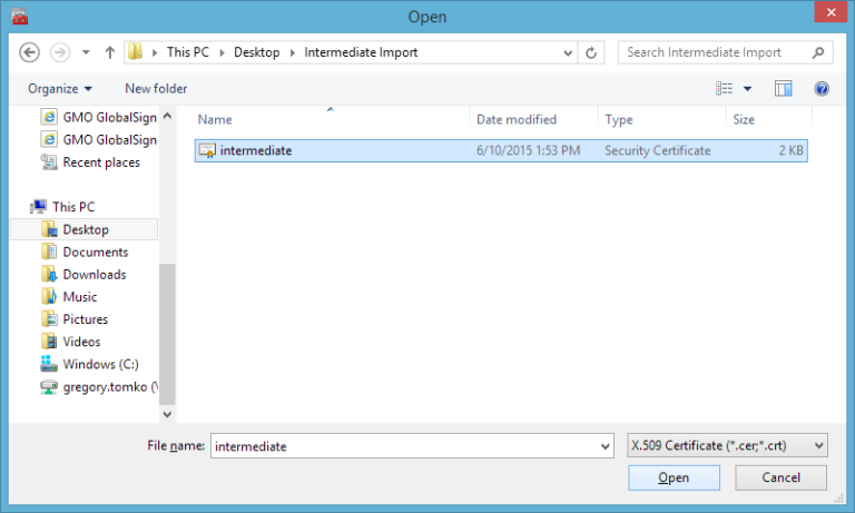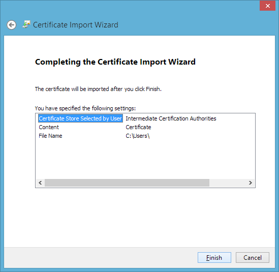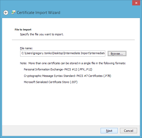 2. Introduzca el nombre del archivo que ha seleccionado al crear su CSR, a continuación, seguir adelante y importar el certificado raíz de confianza (TrustedRoot.crt). Es posible que aparezca un mensaje de que su certificado raíz ya está instalado. Si esto ocurre, simplemente continúe con el paso 3.