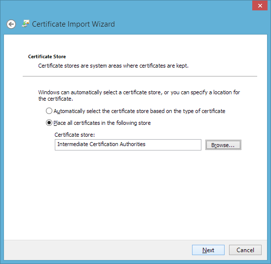 9. El almacén de certificados se puede elegir Siguiente, o ver el certificado si desea verificar que ha instalado el certificado correcto.