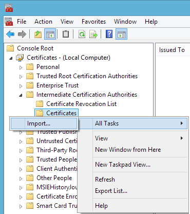 8. Haga clic con el botón derecho en la carpeta Certificados y vaya a Todas las tareas > Importar