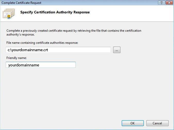 5. En el asistente, escriba la ubicación y el nombre del certificado SSL que ha guardado en el servidor antes y después introduzca un nombre descriptivo.