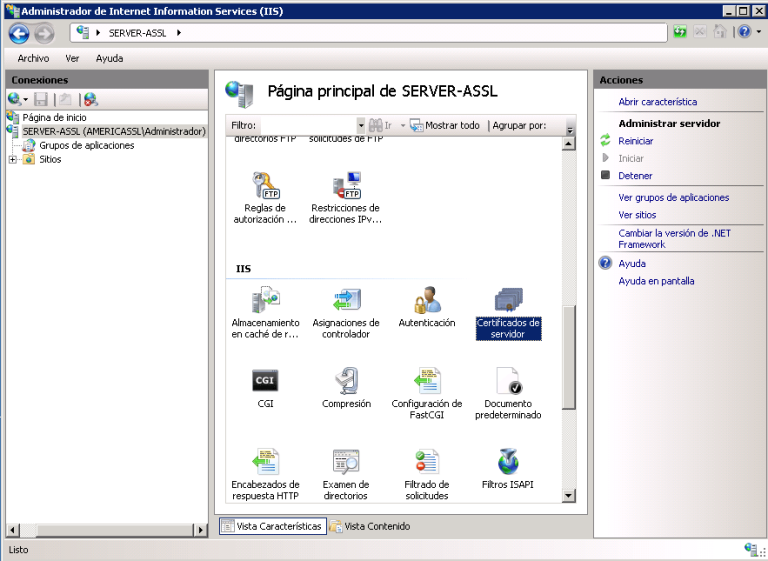 Abra el Administrador de Internet Information Services, seleccione el nombre del servidor y en el menú central busque el icono de Certificados.
