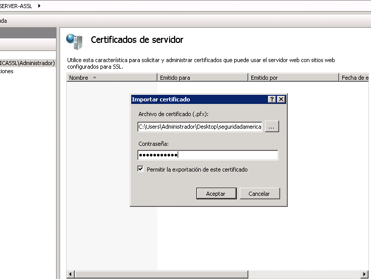 Ingrese la contraseña asociada al certificado pfx. Luego solicitara un puerto este debe ser 443.