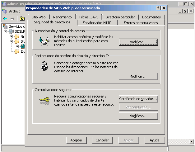 Busque la pestaña Seguridad de Directorios, luego en la parte inferior de la ventana en la sección Comunicaciones Seguras, seleccione Certificado de Servidor.