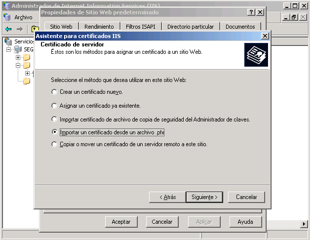 Se iniciará el asistente, clic en Siguiente, ahora busque la opción Importar un certificado desde un archivo .pfx – Siguiente.