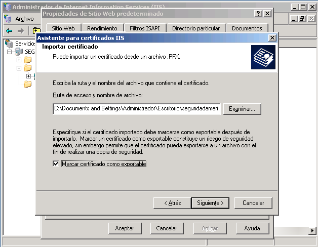 Busque el archivo y marque la casilla para hacer al certificado exportable.