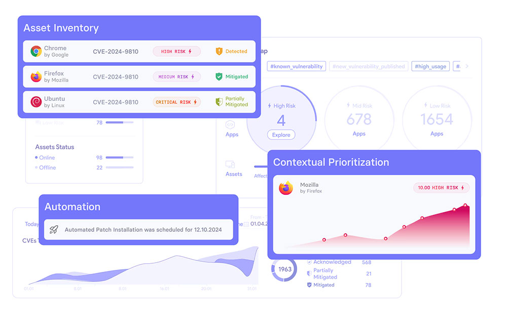Aplicación de parches automatizada y en tiempo real: implementa parches automáticamente en todos los sistemas, reduciendo el tiempo de aplicación en un 80%.
